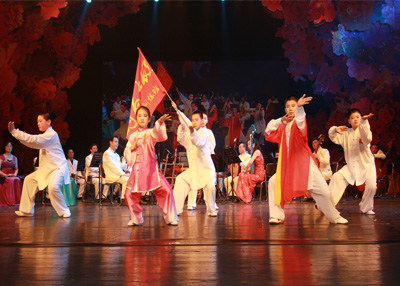 在2015乙未羊年迎新联谊会上,武术分会少年组登台表演中华武魂。